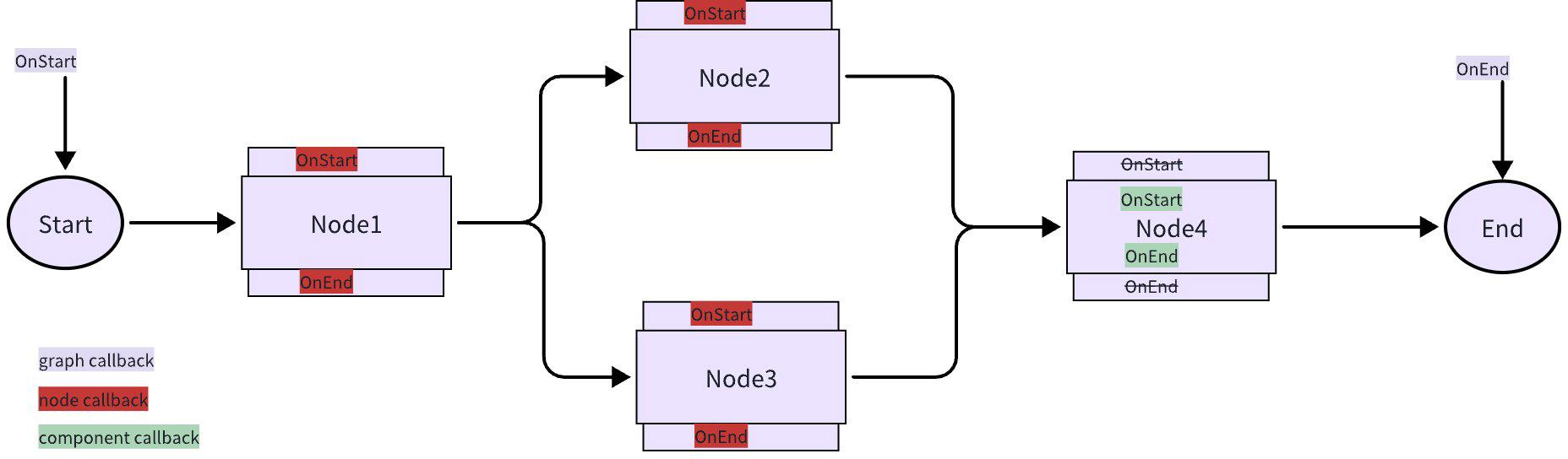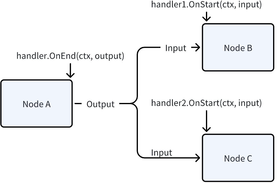 Inject Handlers at graph runtime through compose.WithCallbacks, these Handlers will take effect for the entire current run of the graph, including all Nodes within the Graph and the Graph itself (as well as all nested graphs).
