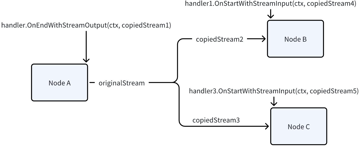 In stream passing scenarios, all downstream nodes and handlers’ input streams are streams obtained from StreamReader.Copy(n), which can be read independently. However, each chunk in the stream is direct variable assignment, if the chunk is a reference type like struct pointer or Map, each copied stream reads the same piece of data. Therefore, in Node and Handler, it’s also not recommended to modify stream chunks, there are concurrency issues.