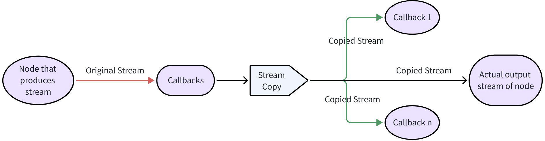 Taking the existence of ChatModel, a node with true streaming output, as an example, when there are Callback aspects, ChatModel’s output stream: