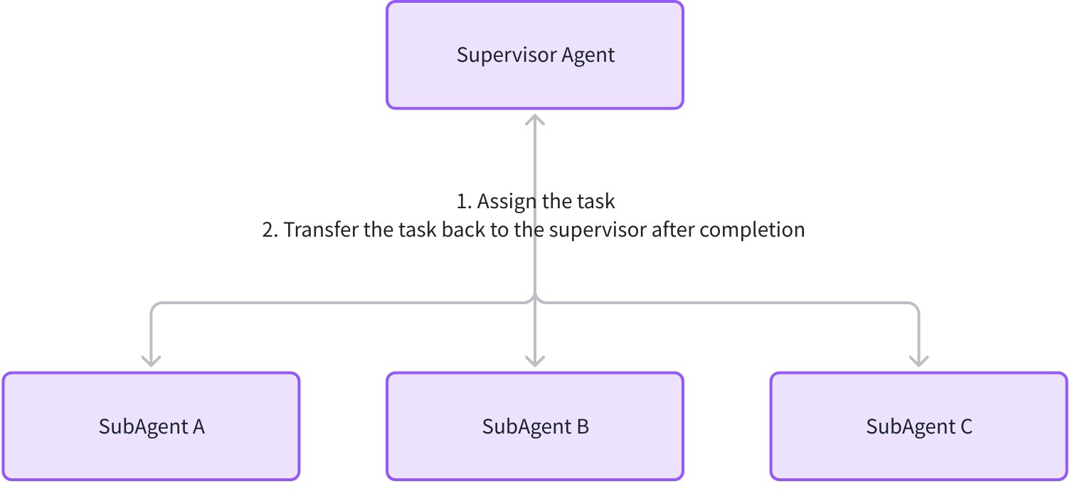 - Centralized control: Supervisor manages subagents and dynamically adjusts task assignments based on subagent results (e.g., assign to another subagent or generate final result directly).