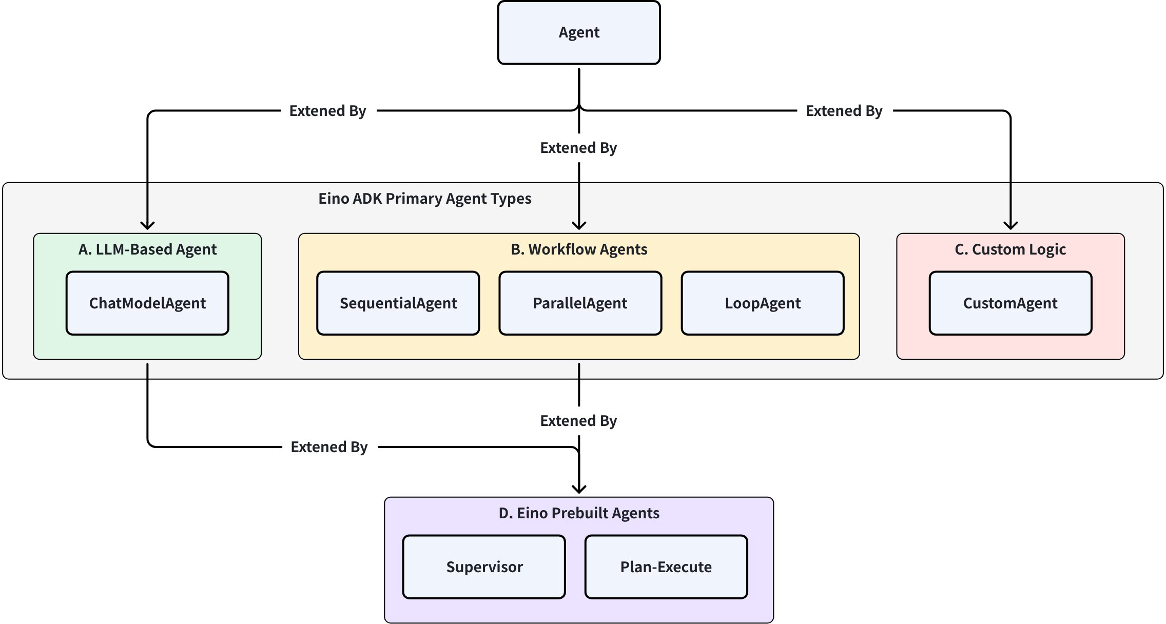 | Category | ChatModel Agent | Workflow Agents | Custom Logic | EinoBuiltInAgent (supervisor, plan‑execute) |